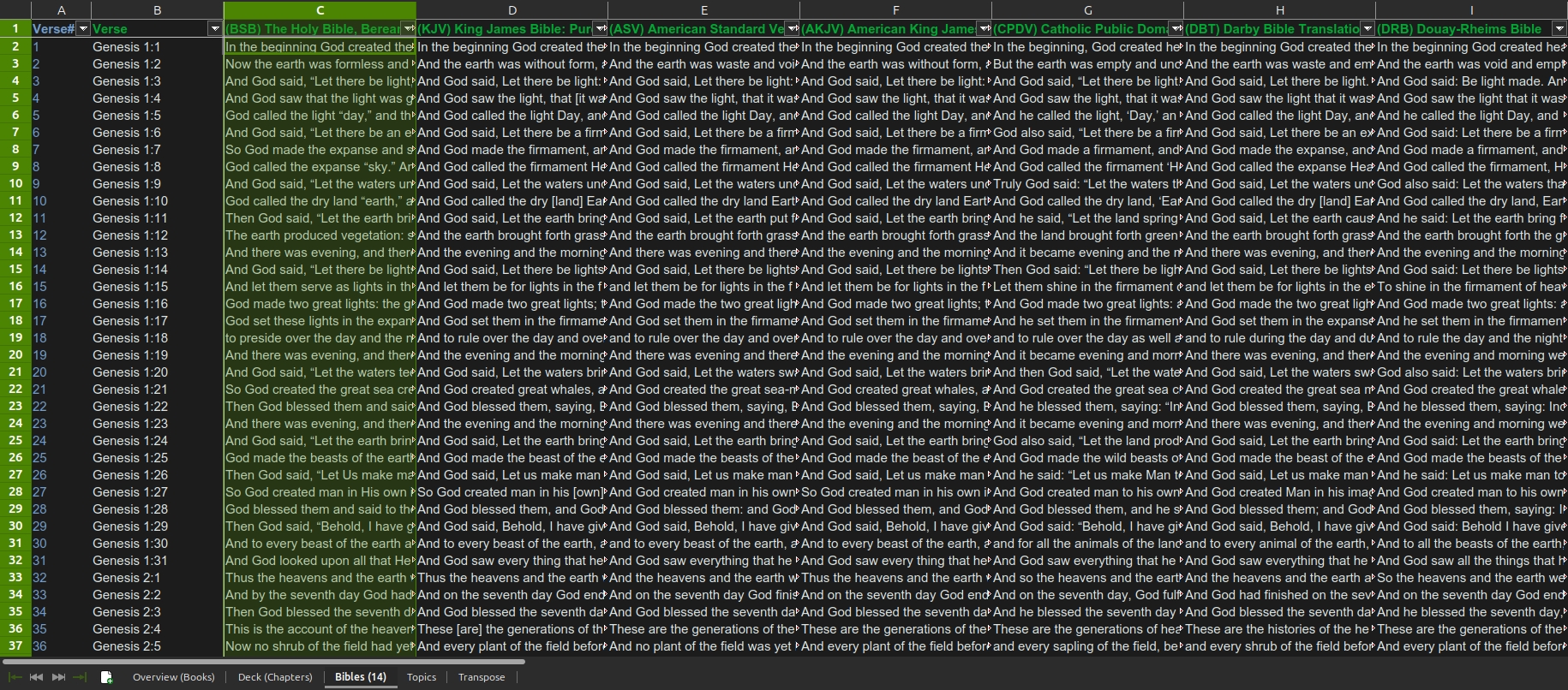 Each translation has the same number of verse rows (31102). Copy the selected translation column into Bible (Verses) sheet in Biblion-Dawg.xlsx to use as primary text:
